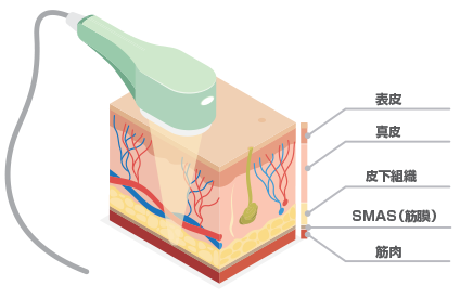 皮膚の表面を傷つけることなく、SMAS層(筋膜)と呼ばれる深い脂肪層までアプローチできるため、